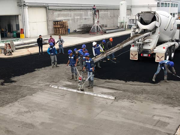 En la imagen se aprecia el colado de un camino de alta intensidad en un parque industrial. Velocidad del colado es más que el doble que el sistema tradicional. Es cómodo esparcir el concreto sobre la rejilla. Sugerimos vibrarlo al colocar para que el agregado se acomode abajo. Después hay que dar un acabado floteado. Sugerimos usar concreto FC 250 para circulación de carga muy pesada, y FC 150 para carga ligera. Agregado de 3/8″ y revestimiento 12. Finalmente obtendremos un acabado estético, industrial de alta resistencia a la carga vehicular.