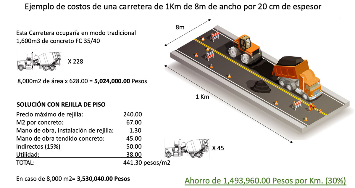 Aumento de la resistencia del concreto hasta 62%. Una mezcla FC” 300 con uso de la rejilla se aumenta a FC” 486 Kg/cm2. Comprobado por laboratorio. De este modo se puede usar un concreto de menor resistencia. Con la rejilla con concreto ahorramos así un monto considerable de recursos. Realmente la rejilla en sí es el que hace la carga. El concreto es un especie de relleno. Este sistema es resistente a los maniobras de los vehículos de gran peso.
